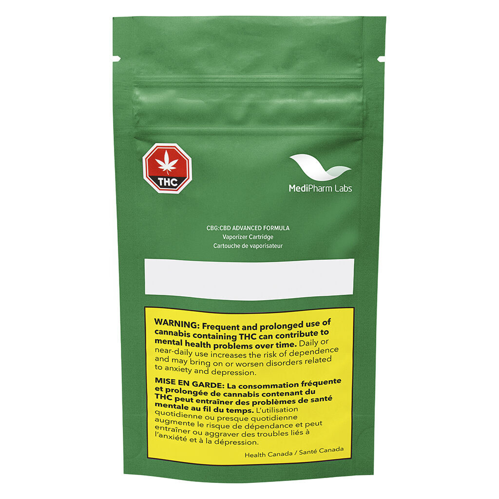 Introducing our CBD:CBG 510 vape, an exceptional blend of CBD and CBG. Our CBG is naturally derived with no synthetic ingredients and is produced at Medipharm Labs using strict manufacturing standards. Made with a hemp-based mouthpiece and packaged in mylar bags made from more than 40% post-consumer materials.