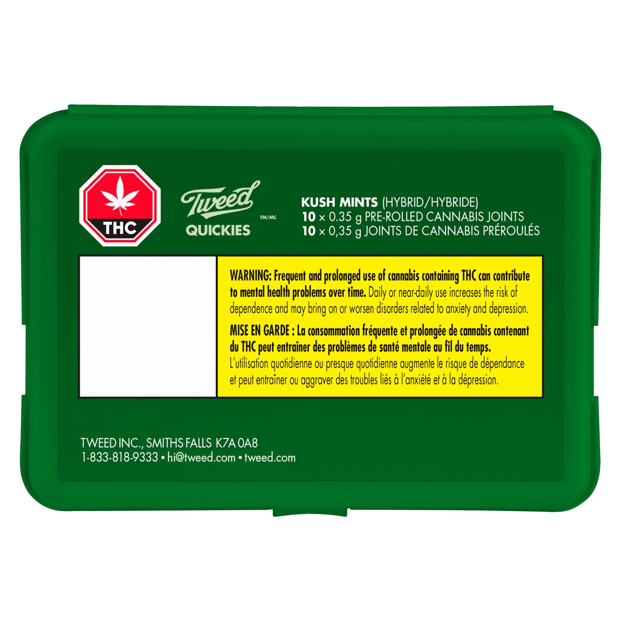 Tweed Quickies pre-rolls are evenly milled and machine rolled for a consistent burn. These Quickies are made with Kush Mints, a high THC indica-dominant hybrid strain known for its unique minty and earthy flavour and aroma profile. Kush Mints comes from a cross of Animal Mints and Bubba Kush. Tweed Quickies come in a convenient, recyclable case, keeping them sealed, protected and ready when you are.