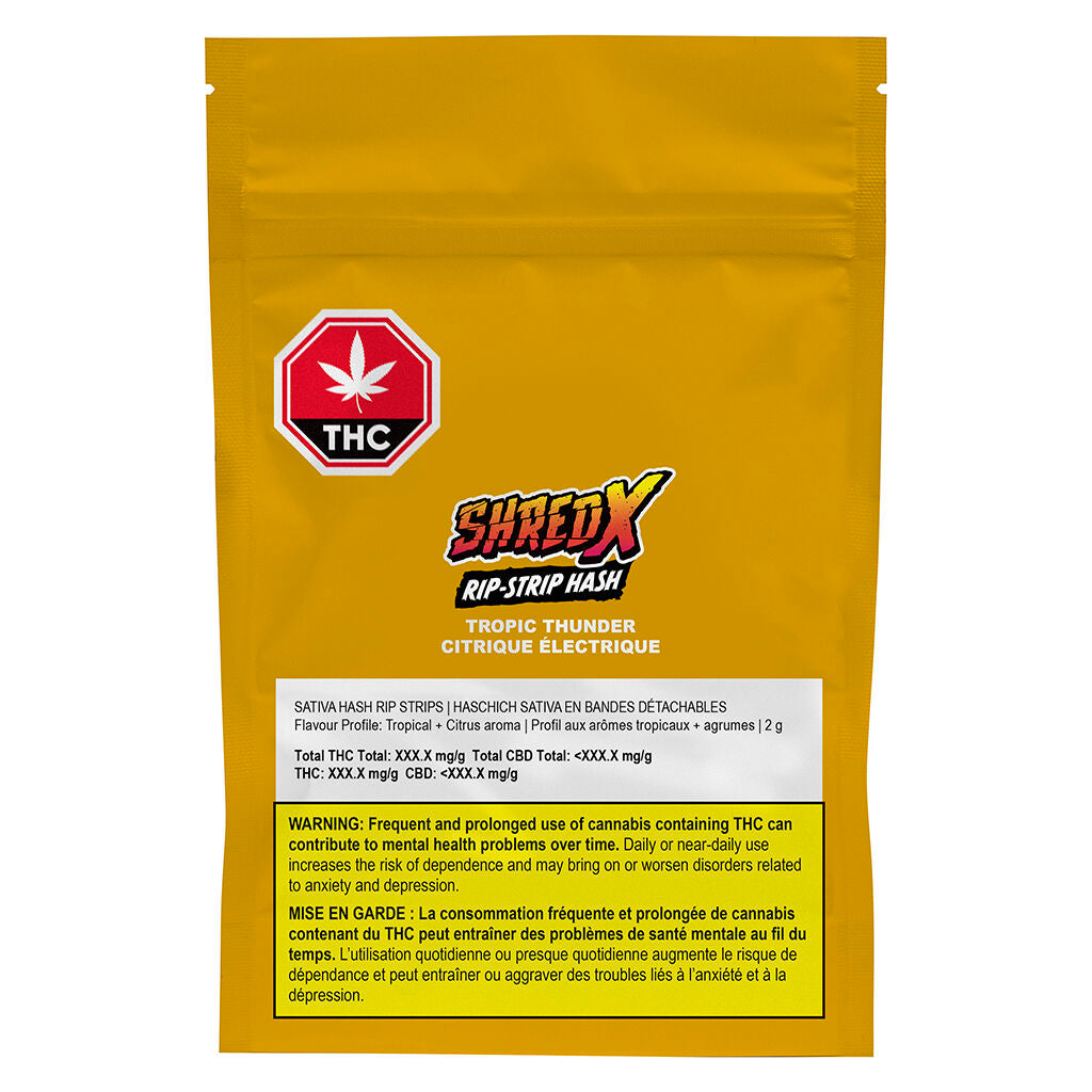 SHRED has reinvented the hash wheel with the introduction of Rip-Strip Hash! We take one of SHRED’s signature aromatic blends, in this case, Tropic Thunder, which is known for its citrus and tropical aromas, press it into hash and then shape that into 10 rip strips. The rip strips can then easily be added to your pre-roll, bowl or pipe for some added potency and flavour.